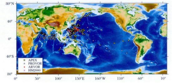 这些浮标由来自 7 个科研院所的 9 名项目负责人承担的国家科研项目资助布放,其中APEX 型剖面浮标(美国Teledyne Webb 研究公司) 178个、PROVOR 型剖面浮标(法国NKE和Martec 公司、加拿大 Metocean 公司) 159个、ARVOR 型剖面浮标(法国NKE 公司)10个,以及6个 HM2000 型剖面浮标( 中船重工第 710 ·研究所),使用的通讯方式有ARGOS,IRIDIUM和北斗( BDS)等卫星系统,分别占由我国布放全部浮标数量的 84%,14%和2%,其中还包含21个加装溶解氧的剖面浮标。