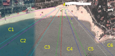 GK-CamR海滩影像实时监测系统,通过安装在沙滩的高塔上的高清网络摄像机,在近岸高湿的环境中长期实时连续获取监测区域海岸的视频数据,由采集软件控制摄像机的工作周期并采集摄像机的录像信息,并对录像截成照片通过网络发送给用户,高清网络摄像机安装时对现场勘测比对建立图像坐标和现实地理坐标的转换关系,处理软件以此坐标转换关系为基础对所获得的照片及录像进行处理实现系统的功能。
