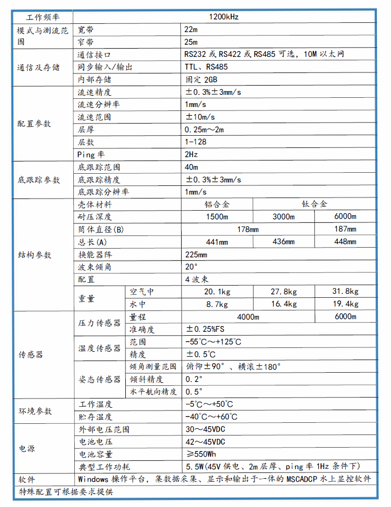 在潜标、海基床等描定在水下的平台上。自容式ADCP主要用于对流场的长期定点观测,主对布放海区的剖面流速进行长期隐蔽观测,是辅助开展海洋勘探、海洋生态研究、海底环境监测、海洋工程的理想选择。