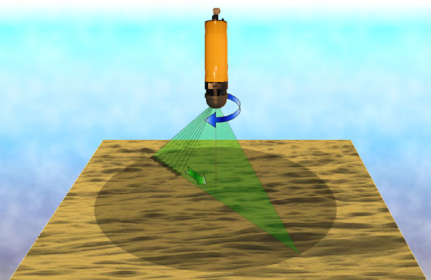 Model 2001 3D 微地貌成像声呐可生成水下地形,结构目标的高分辨率图像。对、河流中淤泥层进行量化计算和侵蚀淤积过程监测。工作状态下,水下声学首先进行水平宽度范围扫描,然后旋转一个很小的角度,再进行水平范围内扫描工作,以此方式一直扫描下去,直到完成传感器下方整个 360°覆盖区域内的扫描工作,如图所示: