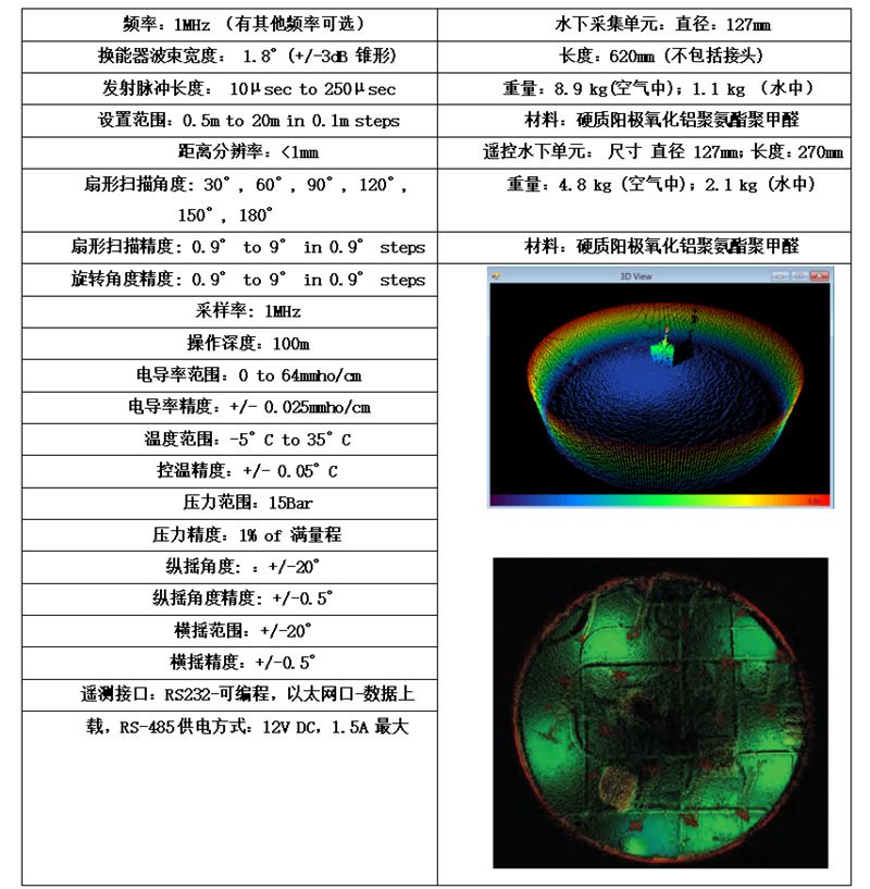 Model 2001 型三维成像声呐包括式和在线自容式两种工作模式,而且声呐系统还可以选配电导率,温度,压力,横摇,纵摇等传感器,极大方便用户在进行海洋测绘的同时,进行多种物理海洋参数的采集。系统完整配置下可以进行原始数据到 ASCII 'XYZ'模式的转化,自容式下具备以太网口,可以将数据上传,而不需要打开压力舱。