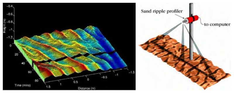 上图所示SRP沙纹剖面成像声呐系统记录的荷兰某地实验泥沙剖面在90分钟内的变化。在大约70分钟时,水槽内的人工波浪被关闭,图中可以看到,此后的沙纹不再发生变化。
