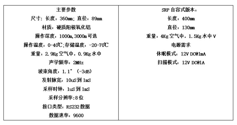 通常,SRP声呐在接近水底处平行于水底安装,以120°角度对水底剖面矩形区域进行扫描。声呐也可自带数据自动记录装置,内置的硬盘可帮助实现远程数据采集。声学信号换能器整体包裹于PVC壳内,无外部运动部件,不会产生额外环境噪声。